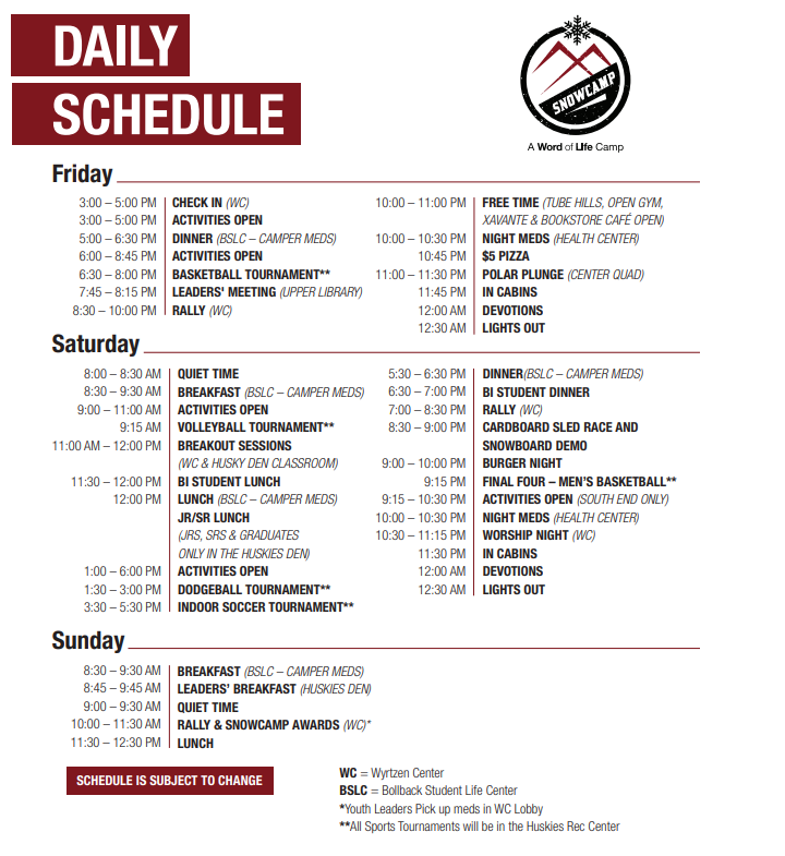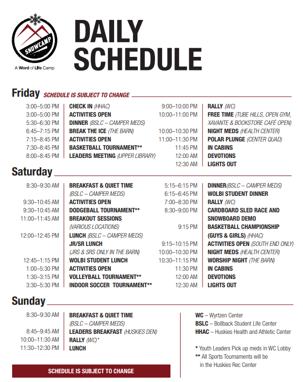 Attached below is a sample schedule from our 2025 Snowcamp season.